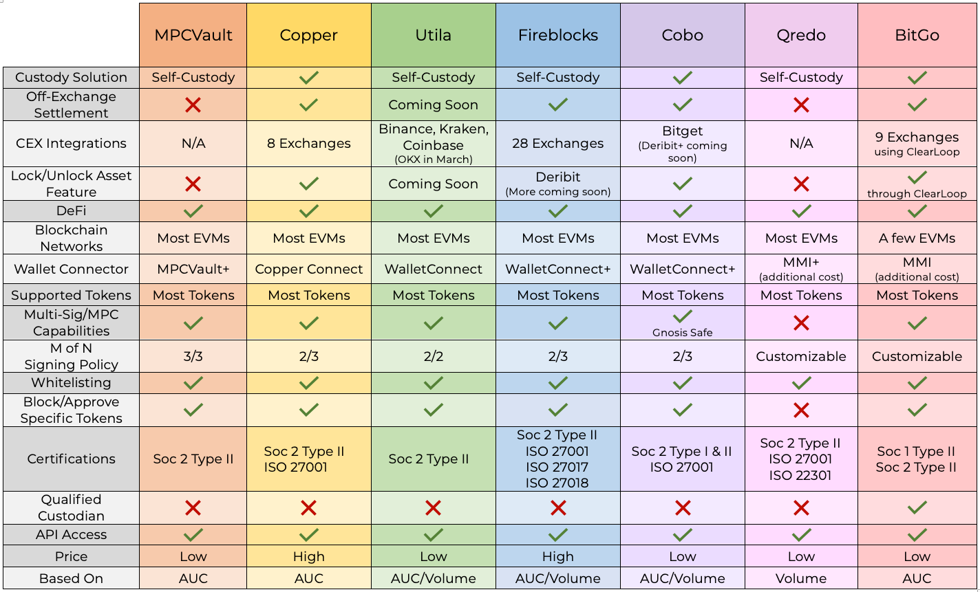 In the rapidly evolving world of crypto, choosing the right custody and off-exchange settlement provider is crucial. After interviewing multiple providers, I quickly realized there’s a lot of solid competition, with the final decision boiling down to pricing and brand reputation. While I couldn’t dig into every provider out there (like Coinbase, HexTrust, and Liminal), my research was driven by our own need to evaluate potential changes in our service providers. After weeks of extensive research, I'm gifting my vast wealth of information to you in an easy-to-understand comparison table. This resource is designed to simplify your navigation in this complex space and help you make well-informed decisions regarding your crypto custody solutions.