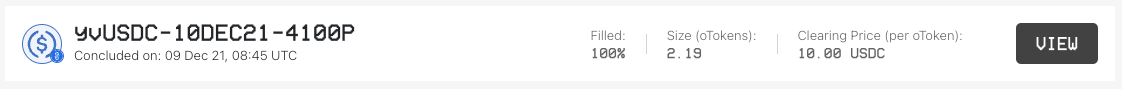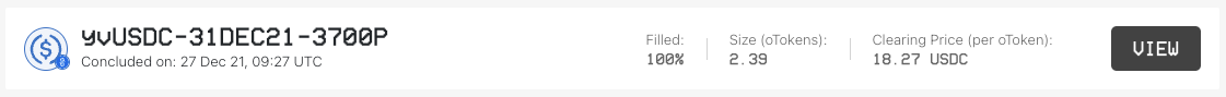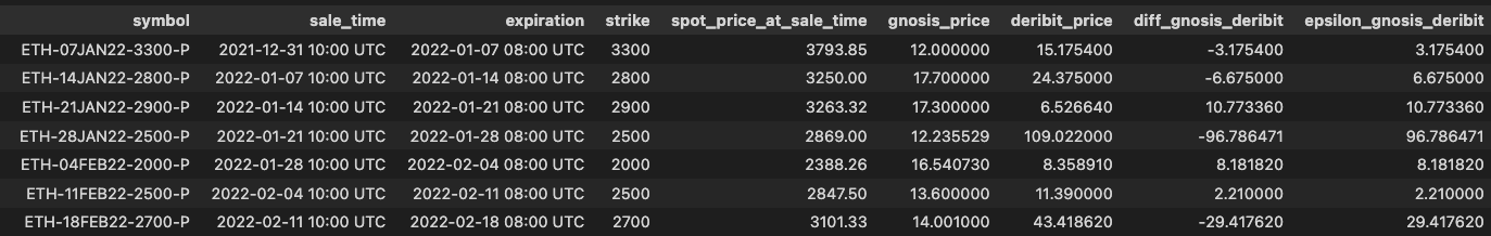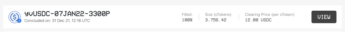 We collected data from the Gnosis period beginning with the option that was underwritten by our selected Ribbon DOV on Dec 31, 2021 at 12:16 UTC, which had a strike price of $3,300 and expired on Jan 7, 2022. The snapshot below captured from Ribbon’s historical auction data page shows the auction information for this option (i.e., the size underwritten in the number of options and its clearing price in Yearn USDC):