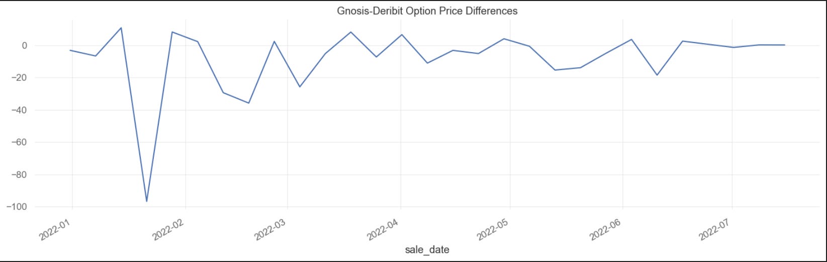 Differences between Gnosis option prices and Deribit option prices over time are plotted below: