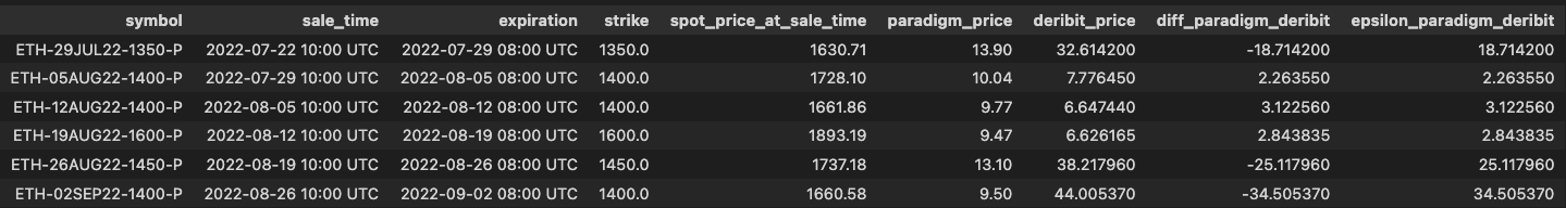 We eliminated no data from the Paradigm period, which consisted of sale dates between July 22, 2022 and April 21, 2023. During this span of time, the selected DOV experienced a single week where it did not write any options, which occurred on March 3, 2023. In total, we collected 39 observations from the Paradigm period. A sample of the first 6 observations is shown below: