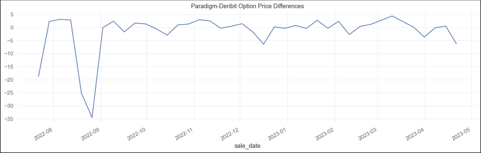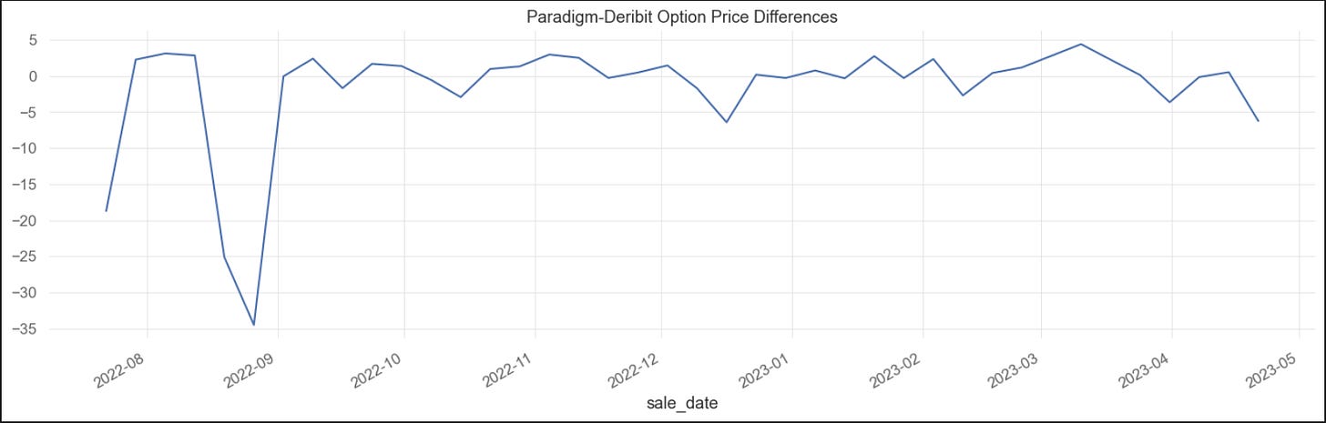 Differences between Paradigm option prices and Deribit option prices over time are plotted below: