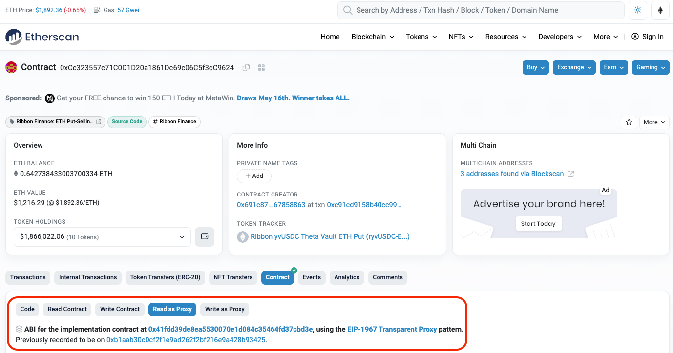 To demarcate the period of Gnosis auctions from the period of Paradigm auctions for the A/B test, we need to locate the exact Paradigm auction launch date for the chosen DOV. We turned to the smart contract for the selected Ribbon DOV to locate this date. The vault’s smart contract address is 0xCc323557c71C0D1D20a1861Dc69c06C5f3cC9624. By viewing this contract on etherscan from the “Contract” tab, we can see that it is a proxy contract and that two implementation contracts have been created for this proxy contract, as shown below: