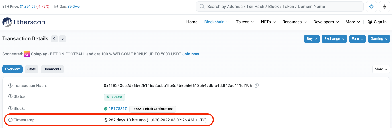 We then click the address link next to “the implementation contract” (0x41fDd39De8Ea5530070E1D084c35464Fd37CbD3E) and subsequently click the address link of the creation transaction hash (0x418243ce2d76b625116a2bdbb1fc3d4b5c556613e547dbfa4ddf42ac411cf195). A snapshot of the creation transaction page displays the contract’s creation timestamp, which represents the time after which Ribbon DOVs started using the Paradigm auction system.