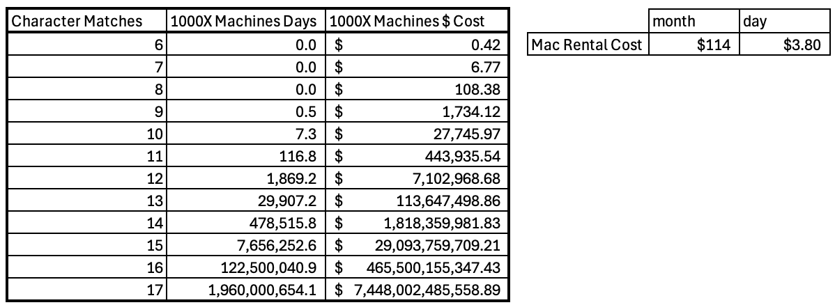 The cost that would correspond to the attack discussed at the beginning of this article would be the 7 Character Matches row. You can see that the estimated cost for this would be $6.77.