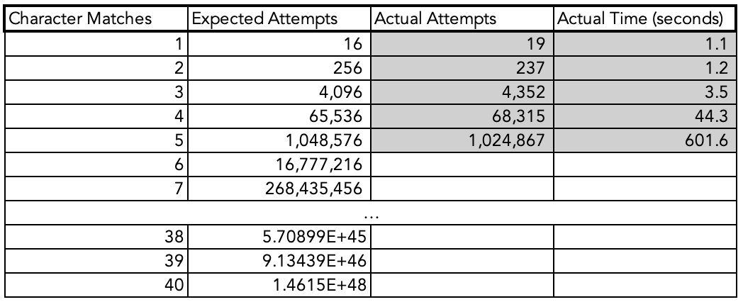 For this illustration I stopped at 5 character matches, but you can observe from 4 to 5 character matches there was an increase of ~13.7X in time (44 seconds for 4 matches, and 601 seconds for 5 matches). This is close to the 16X expected time increase for each additional match. This is sufficient to prove the pattern and I didn’t want to wait around for 2.5+ hours for a 6 character match (let alone ~40 hours for a 7 character match) to be found and these results are conclusive enough.